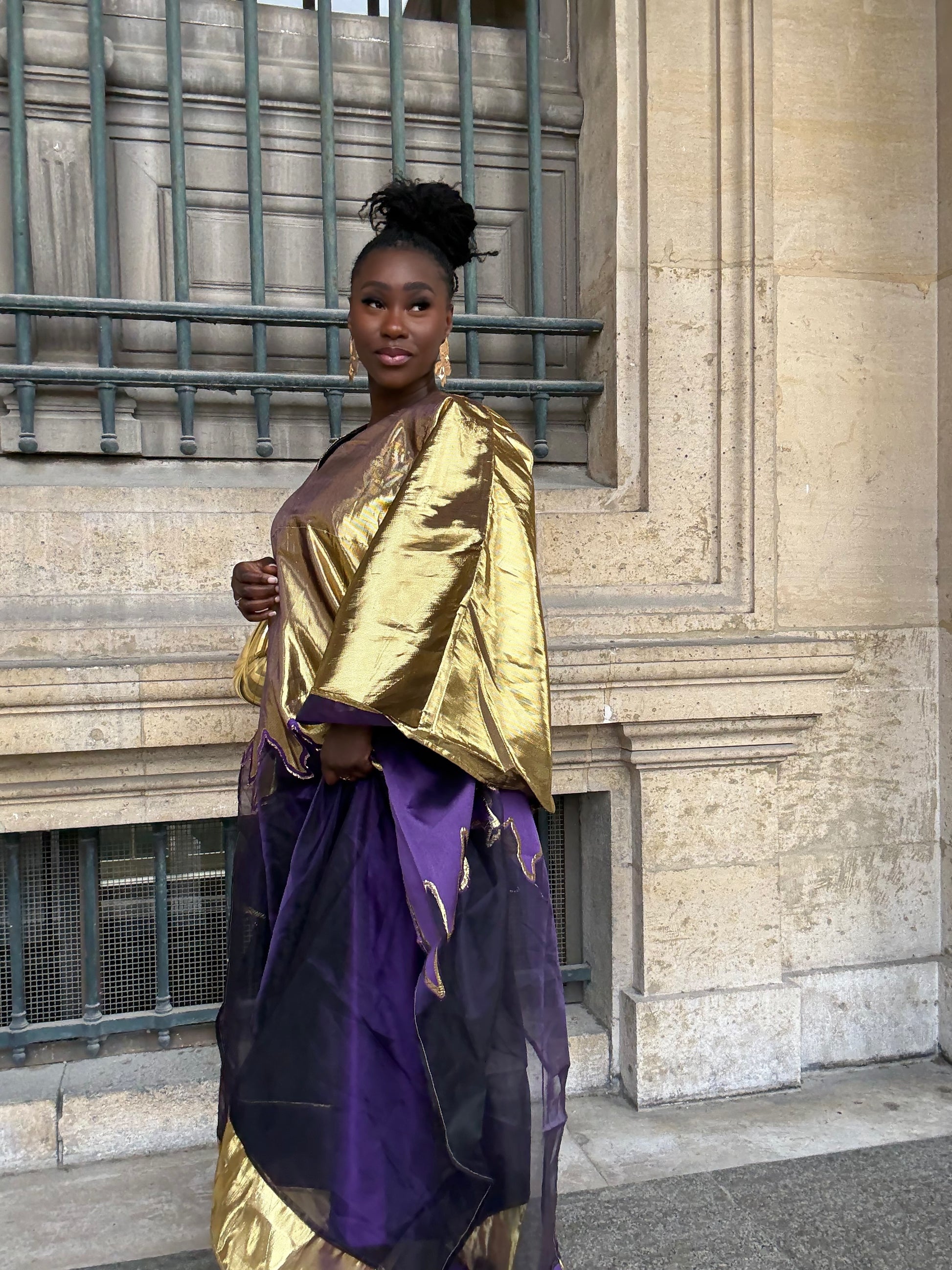 Sa sous-robe en satin doux glisse délicatement sur la peau, offrant un confort luxueux et une allure fluide. Par-dessus, le tissu principal doré capte chaque reflet de lumière, pour une présence scintillante et inoubliable. Le mariage entre le satin et le doré crée un jeu de textures chic et raffiné, idéal pour les grandes occasions : soirées, mariages, réceptions ou fêtes traditionnelles.
