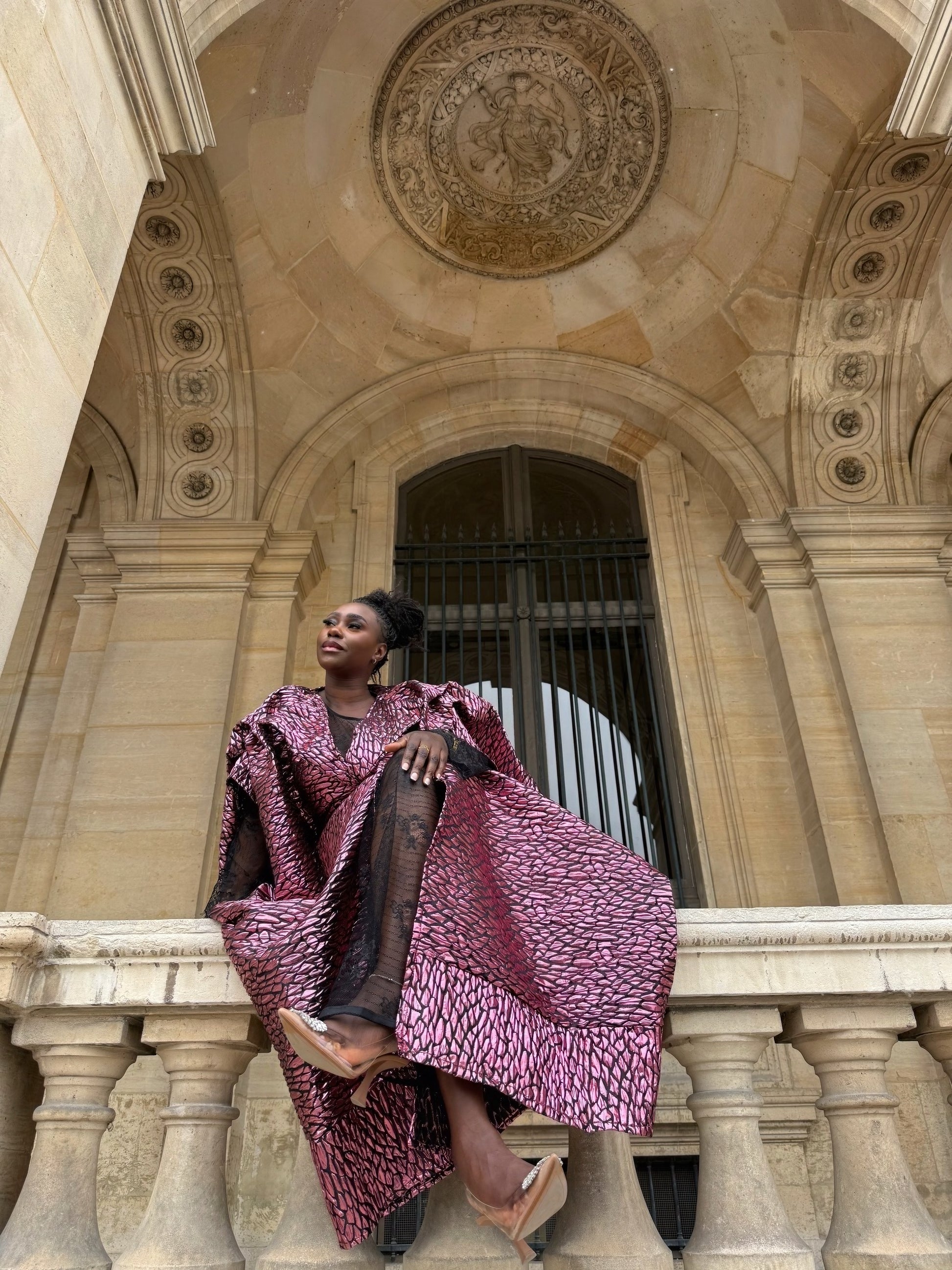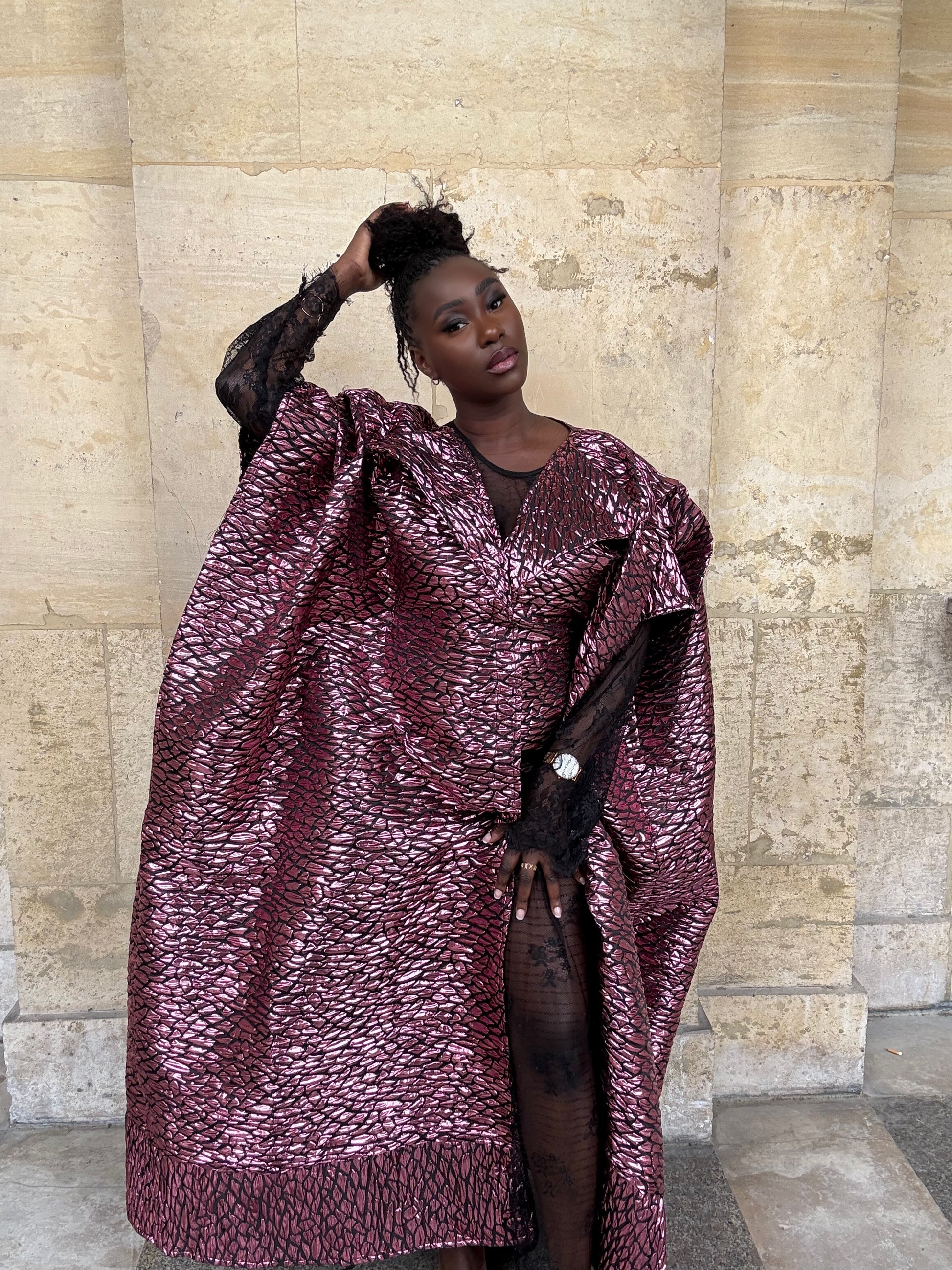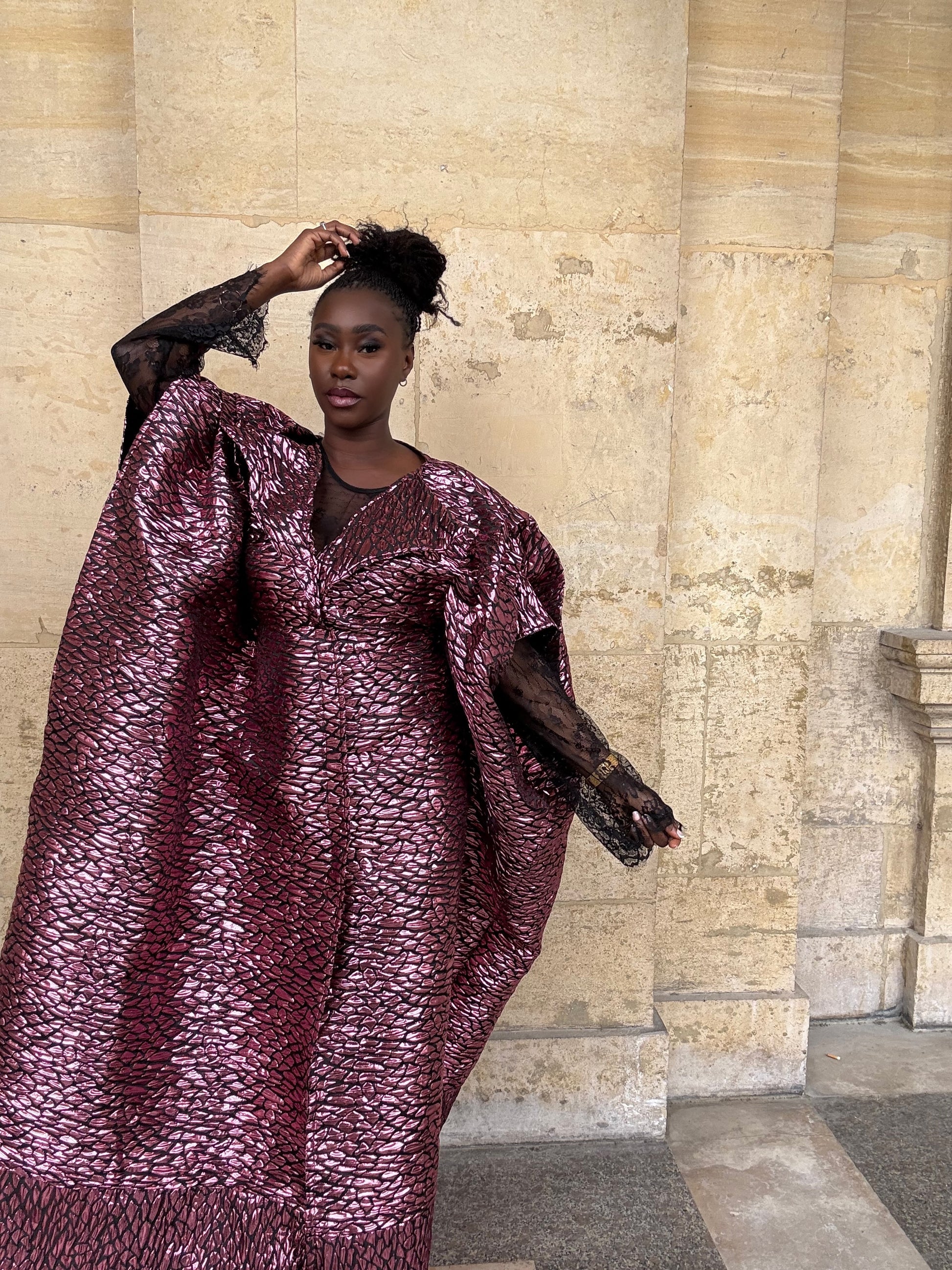 Ce boubou revisité allie la noblesse d’un volume fluide à la subtilité d’une sous-robe en dentelle délicate, révélant sans trop montrer, suggérant sans exposer. Le résultat ? Une silhouette aérienne, raffinée, profondément féminine, sans jamais tomber dans l’excès.